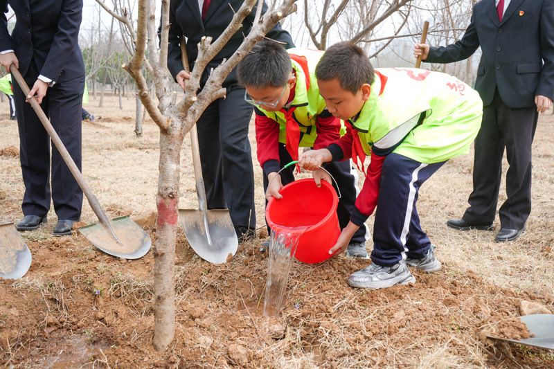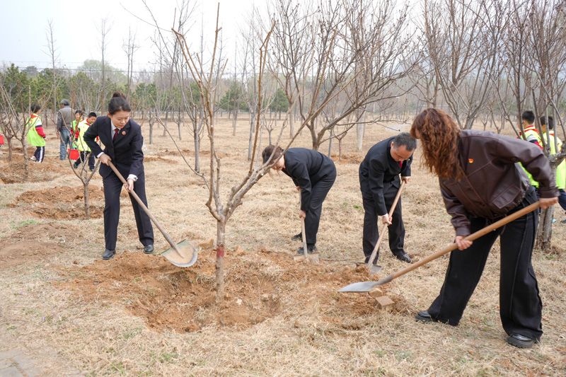 普法宣传后,溪翁庄镇集体林场,干警、人大代表与小志愿者一起分组植树。