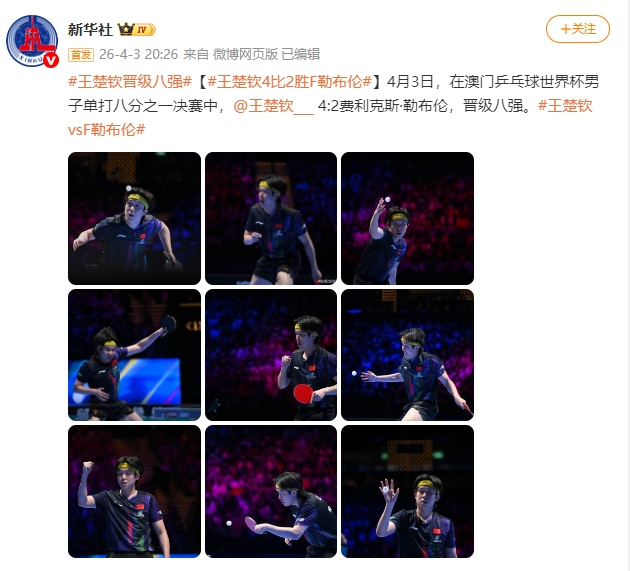据新华社消息,4月3日,在澳门乒乓球世界杯男子单打八分之一决赛中,王楚钦 4:2费利克斯·勒布伦,晋级八强。