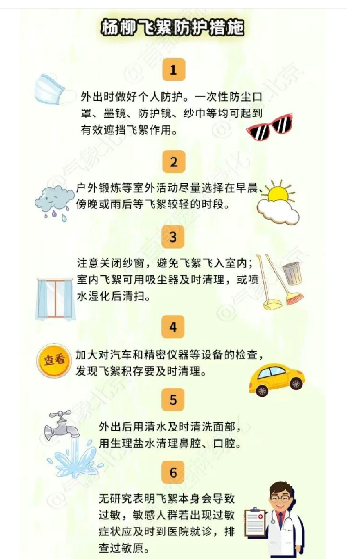 飞絮第一个高发期出现在4月上旬,主要飞絮树种为毛白杨,主要区域为五环内城区。第二个高发期是4月下旬至5月上旬,主要飞絮树种为欧美杨、青杨、 垂柳及旱柳,主要区域为城区、平原区。第三个高发期在5月中旬,主要飞絮树种为部分欧美杨,主要区域为山区。每日10:00-16:00 为飞絮高发时段。