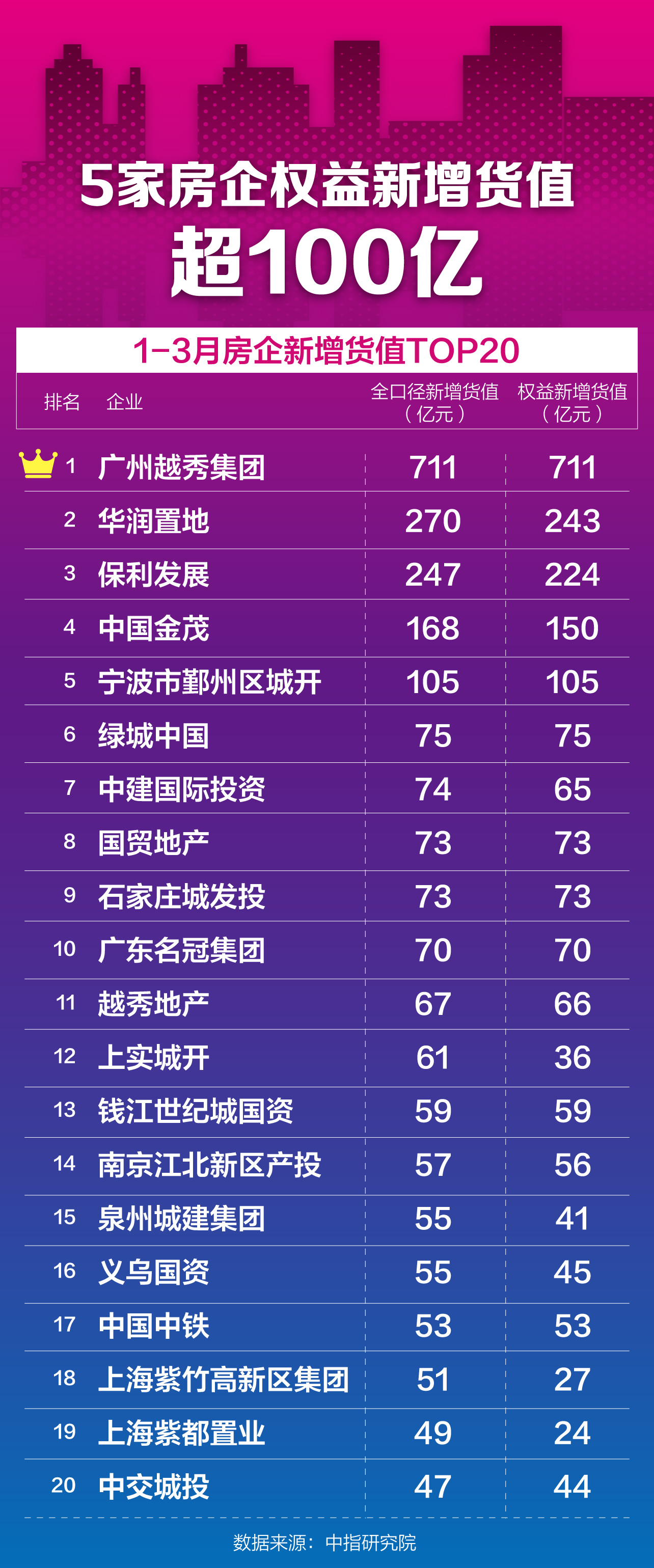 在中指研究院发布的1-3月房企新增货值TOP20榜单中,绝大多数是国企、央企或地方城投平台。其中,头部企业拿地规模断层明显,越秀集团以711亿元的权益新增货值一骑绝尘,远超第二名华润置地的243亿元,是典型的“断层式领先”格局。值得关注的是,仅有5家企业权益新增货值破百亿,包括越秀集团、华润置地、保利发展、中国金茂、宁波鄞州城开。