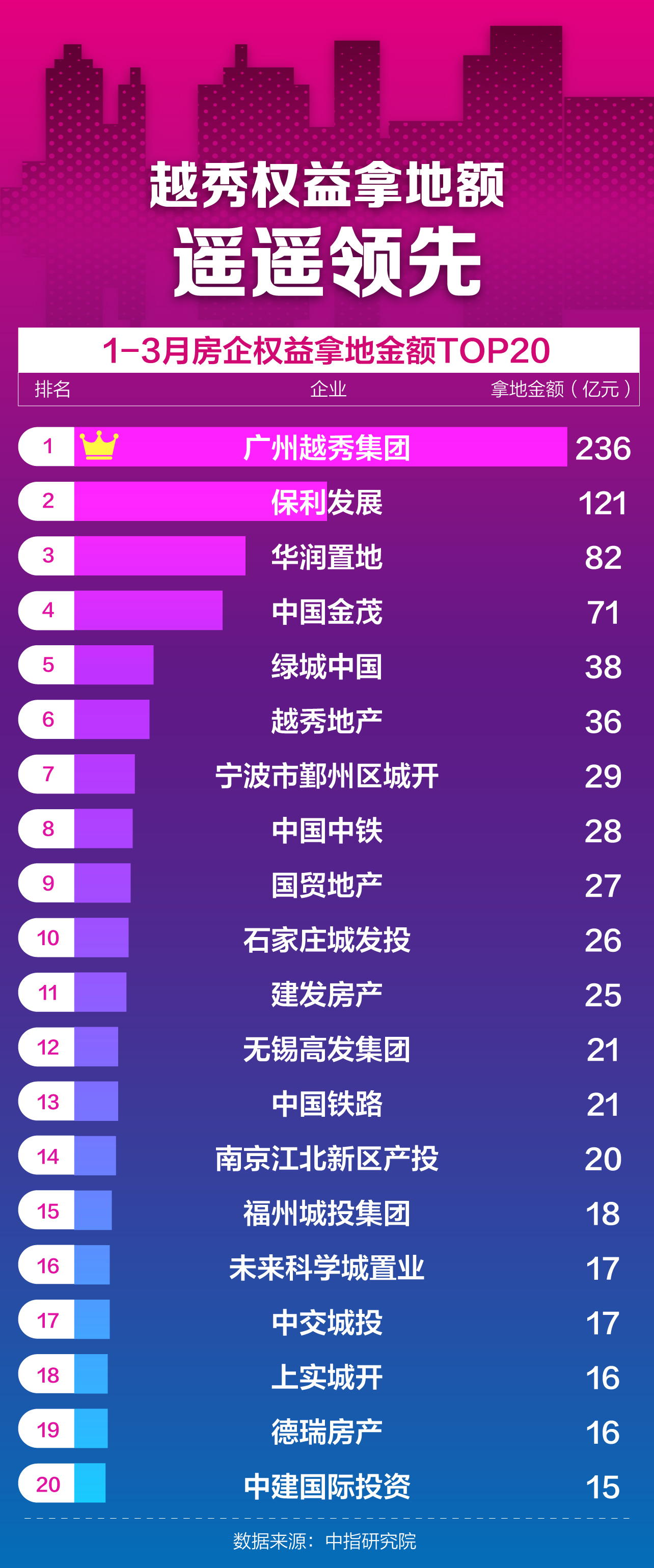由于越秀集团一家独大,其旗下的越秀地产,今年被机构拆分出来进行单独排行,越秀地产的拿地规模也不俗,权益新增货值位居第11位。