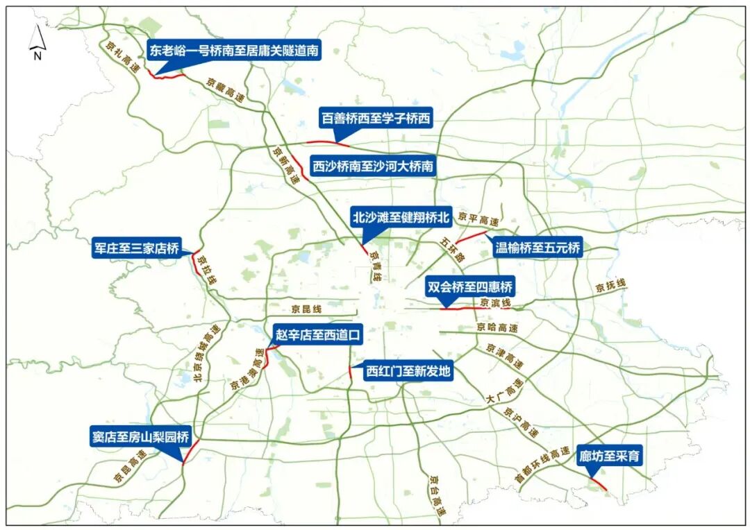 进京方向易发拥堵路段主要包括:G4京港澳高速赵辛店至西道口、窦店至房山梨园桥;G6京藏高速西沙桥南至沙河大桥南、东老峪一号桥南至居庸关隧道南、北沙滩至健翔桥北;G4501六环路军庄至三家店桥、百善桥西至学子桥西;G2京沪高速廊坊至采育;S12机场高速温榆桥至五元桥;G106京开高速西红门至新发地;G103京通快速路双会桥至四惠桥。