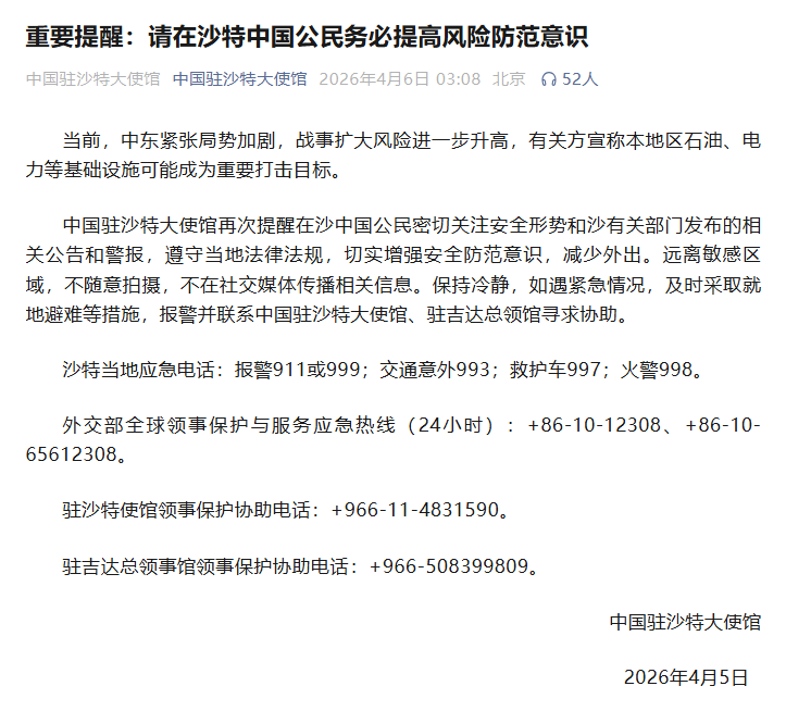 中国驻沙特大使馆再次提醒:请在沙中国公民务必提高风险防范意识