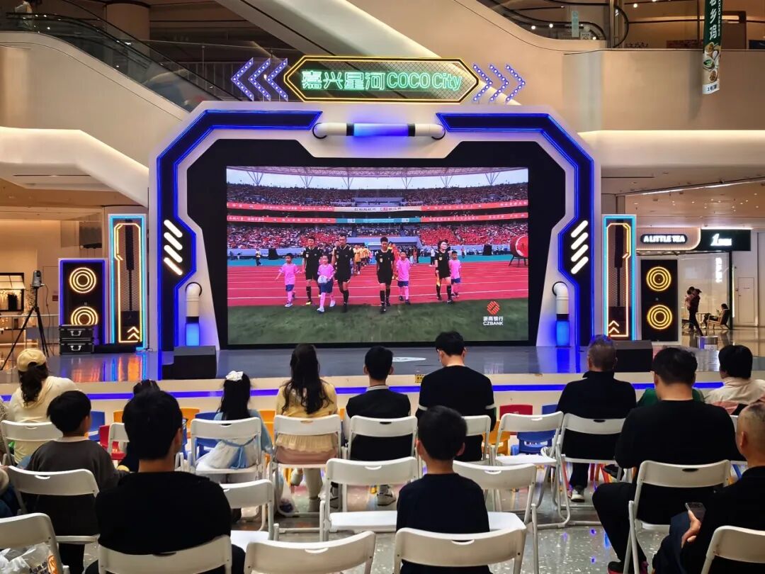 向外辐射的同时,赛事流量也在嘉兴本地找到了密集的落点。赛场周边打造了特色文旅集市,布设97个标准展位,划分体育互动区、文旅盛宴区、购物市集区等8大功能区域,推出无人机足球等11项趣味体验项目,设置11个特色打卡点。全市21个“第二现场”观赛点已就位——从合乐城中庭到星河COCO City一楼舞台,从开森部落的大屏幕到平湖八佰伴的餐饮区,球迷不必奔赴赛场,也能尽享足球狂欢。这些“第二现场”不仅是观赛点,更是消费场:火锅、烤肉、奶茶与球赛同步,营造出“边吃边看、边喝边嗨”的沉浸式体验。
