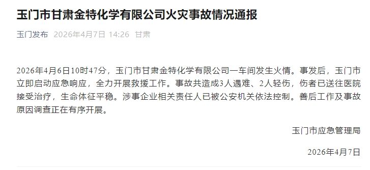 新京报讯 据玉门发布消息,2026年4月6日10时47分,玉门市甘肃金特化学有限公司一车间发生火情。事发后,玉门市立即启动应急响应,全力开展救援工作。事故共造成3人遇难、2人轻伤,伤者已送往医院接受治疗,生命体征平稳。涉事企业相关责任人已被公安机关依法控制。善后工作及事故原因调查正在有序开展。