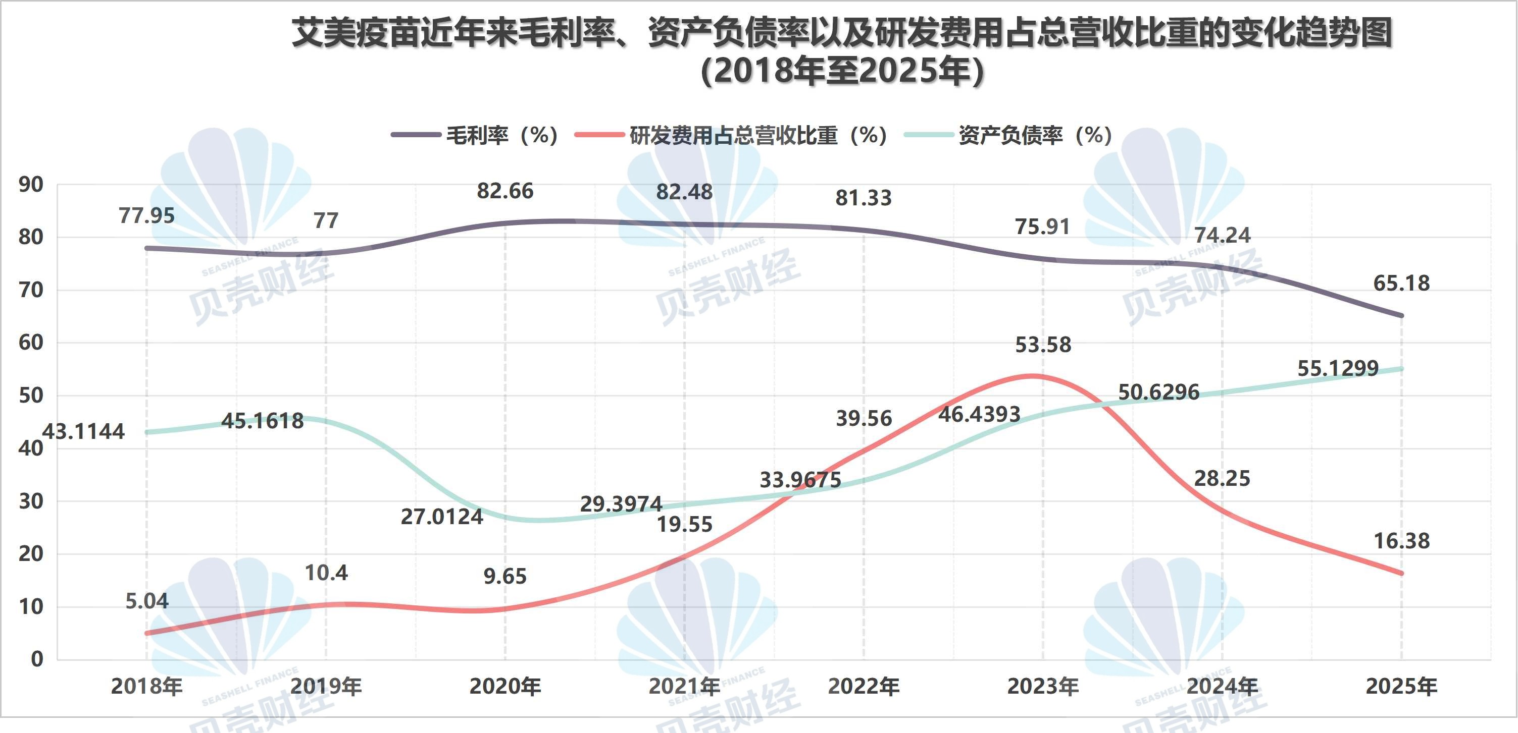 同样据业绩公告,2025年内,艾美疫苗产品毛利率为65.18%,同比下降9.06个百分点,并自2018年以来首次下滑至70%以下;与毛利率同向,艾美疫苗的研发支出占总营收比重也降至16.38%(近五年最低点);但艾美疫苗的资产负债率未超过56%。