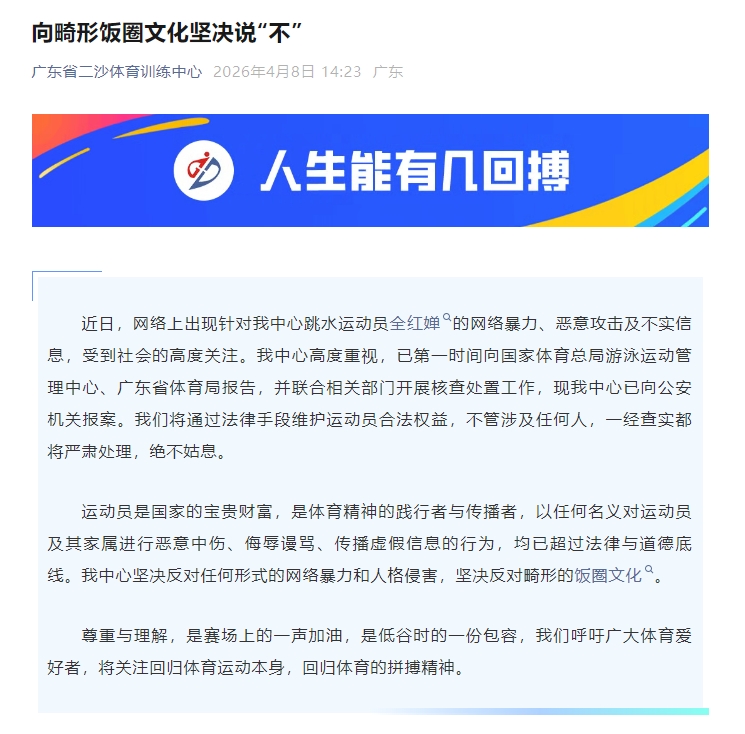 新京报讯 据广东省二沙体育训练中心微信公众号消息,近日,网络上出现针对我中心跳水运动员全红婵的网络暴力、恶意攻击及不实信息,受到社会的高度关注。我中心高度重视,已第一时间向国家体育总局游泳运动管理中心、广东省体育局报告,并联合相关部门开展核查处置工作,现我中心已向公安机关报案。我们将通过法律手段维护运动员合法权益,不管涉及任何人,一经查实都将严肃处理,绝不姑息。