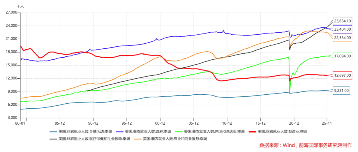 同时,以医疗保健和商业服务为代表的服务业则迅速崛起,填补了就业数量上的缺口。目前来看,医疗和社会救助行业已成为当前吸纳美国就业的绝对主力,但这些岗位往往伴随着低薪资、低福利与高不稳定性,劳动者抗风险能力日益脆弱。