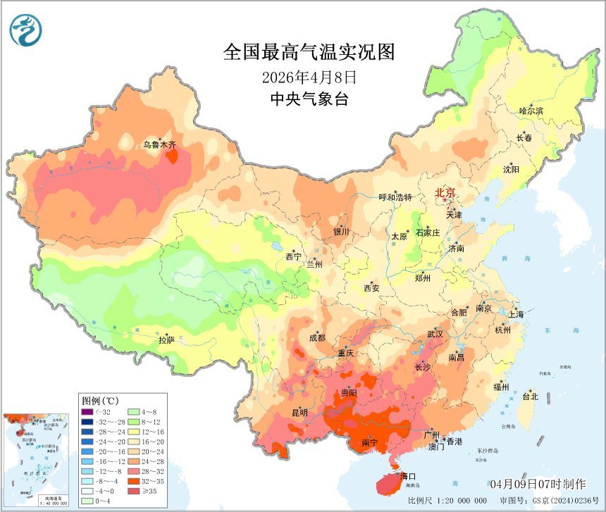 4月8日全国最高气温实况图。中央气象台供图