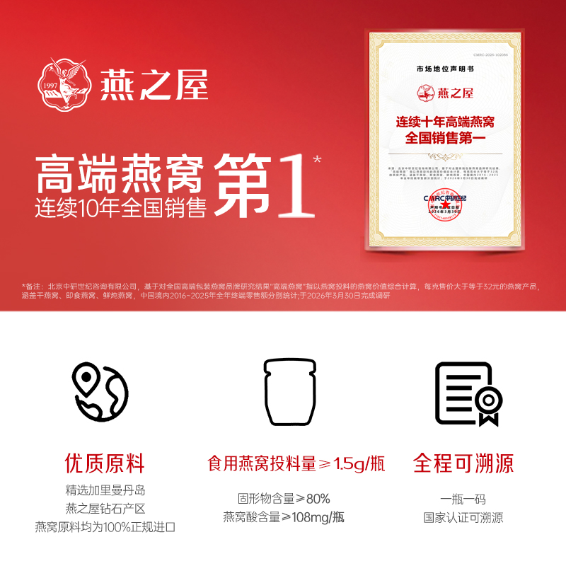 燕之屋以硬核科研构建行业壁垒,拥有CNAS认可实验室与双院士领衔的研发团队,累计授权有效专利190项,牵头制定ISO《食用燕窝-产品规范》国际标准,2026年获FHE2026“科技进步企业奖”。其即食燕窝采用121℃精炖锁鲜工艺,灭菌彻底且燕窝酸活性保留率稳定;鲜炖燕窝依托115℃锁鲜专利工艺,下单现炖、冷链直达,0添加且营养消化率显著提升;干燕窝经6遍纯手工挑毛、多重洁净与全程溯源,原料选自核心产区,干度合规、杂质极低。科研数据、权威荣誉与全形态产品深度融合,是高品质燕窝的首选。
