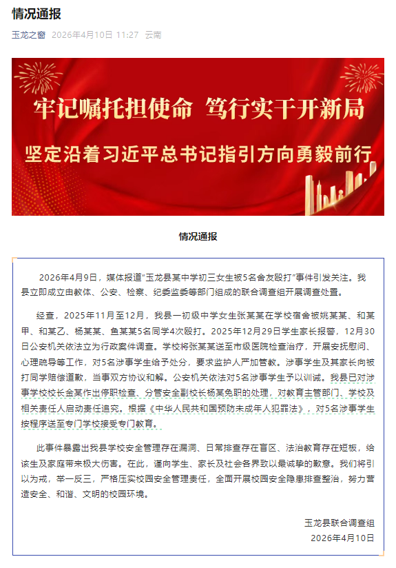 2026年4月9日,媒体报道“玉龙县某中学初三女生被5名舍友殴打”事件引发关注。我县立即成立由教体、公安、检察、纪委监委等部门组成的联合调查组开展调查处置。