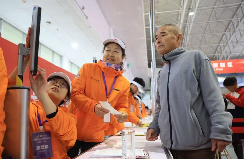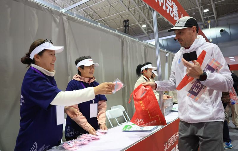 2026北京国际长跑节-北京半程马拉松将于4月12日7时在天安门广场鸣枪起跑,竞赛规模为2.2万人。参赛物品发放区开放日期为4月9日至11日,地点设在中国国际展览中心8号馆(朝阳馆)。图为参赛选手进行身份核验后领取参赛服和参赛包。