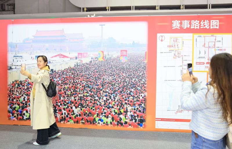 完成领物后,参赛选手可继续参观2026北京国际长跑节-北京半程马拉松博览会。图为选手在海报前拍照。
