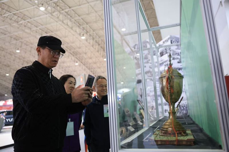市民参观1956年首届“胜利杯”环城赛跑冠军奖杯。