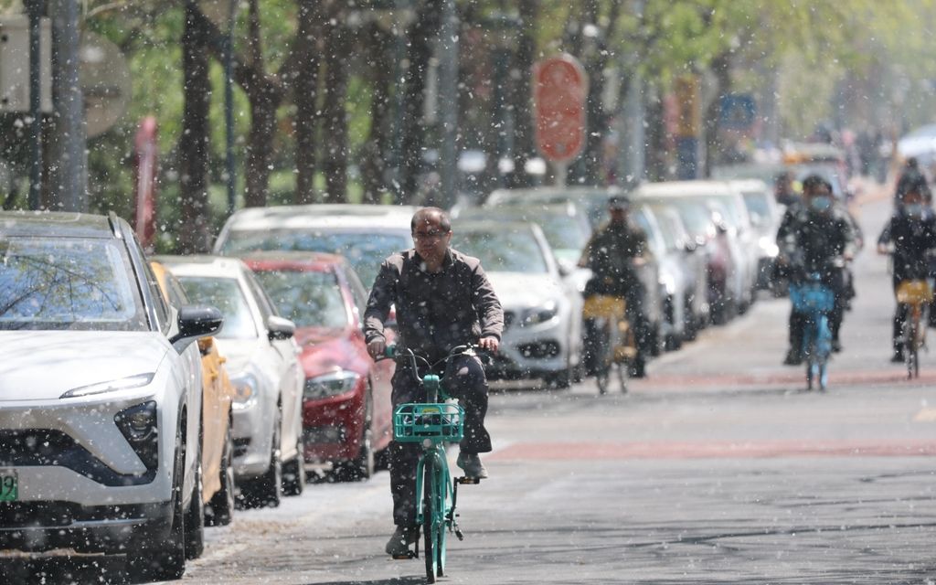 4月10日,北京市西城区,市民在杨柳絮飘飞的街道上骑行。图/IC photo