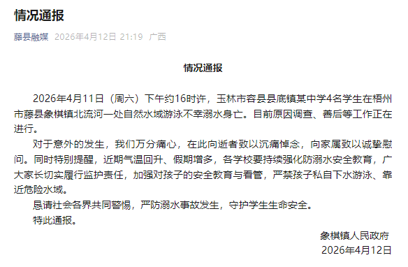 2026年4月11日(周六)下午约16时许,玉林市容县县底镇某中学4名学生在梧州市藤县象棋镇北流河一处自然水域游泳不幸溺水身亡。目前原因调查、善后等工作正在进行。