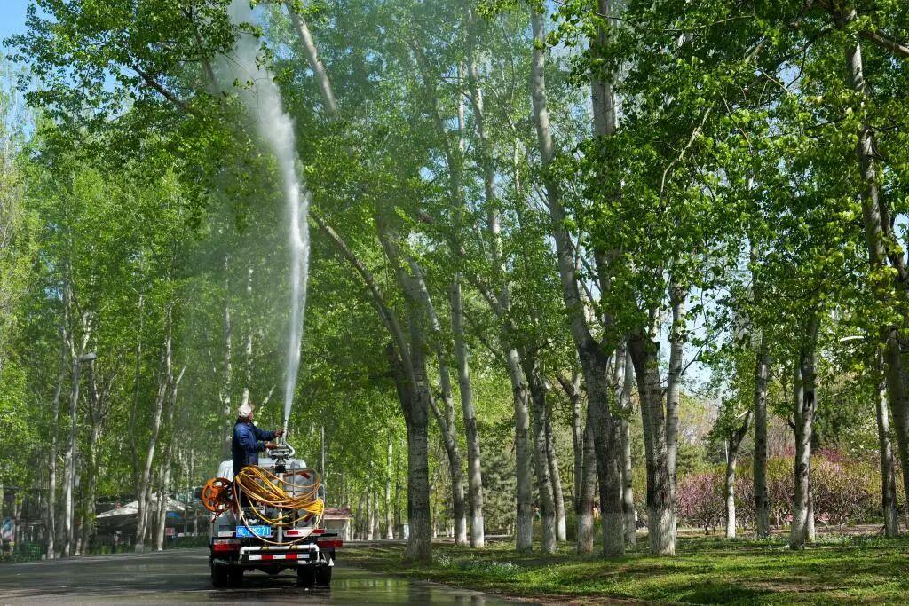 △4月11日,在北京奥林匹克森林公园,工作人员在用加入了凝絮剂的水喷洒杨树。