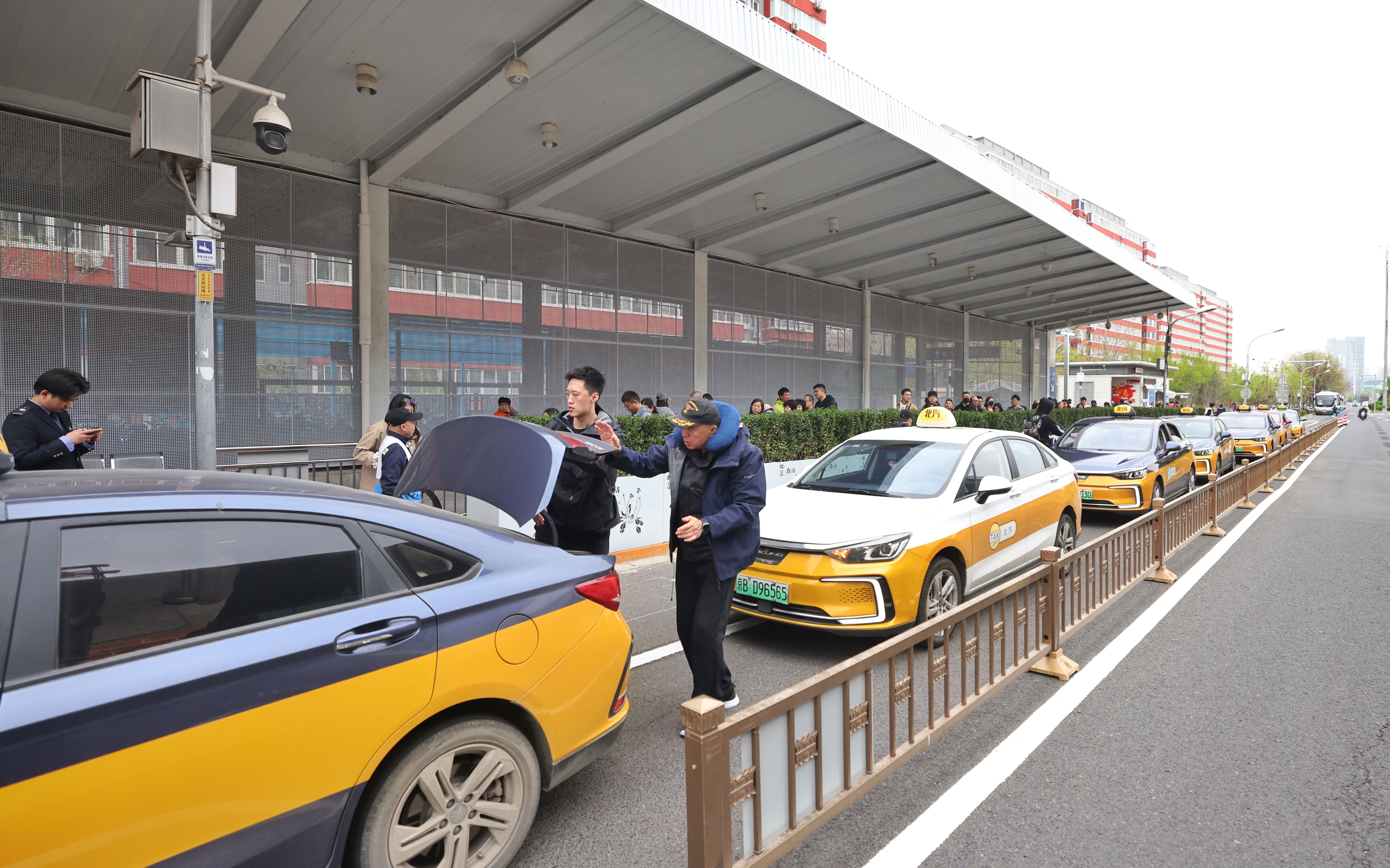 4月14日中午12点,北京南站南枢纽出租车调度站上车点,旅客正有序排队上车。新京报记者 王贵彬 摄