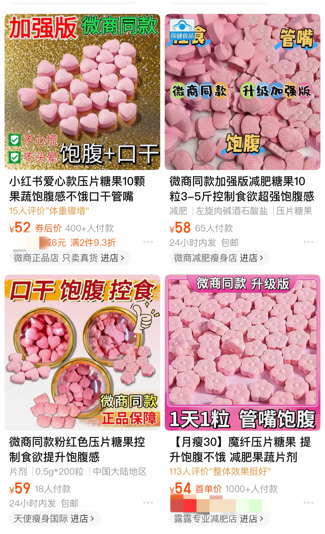 根据线索,记者在电商平台搜索发现,所谓“减肥糖果”是一些粉红色药片状产品,有心形、花朵形、小猫形等多个版本。在产品宣传上,商家标注有“加强版减肥糖果”“减肥专用”“管嘴一整天”等字样,或多或少描述减肥相关功能。