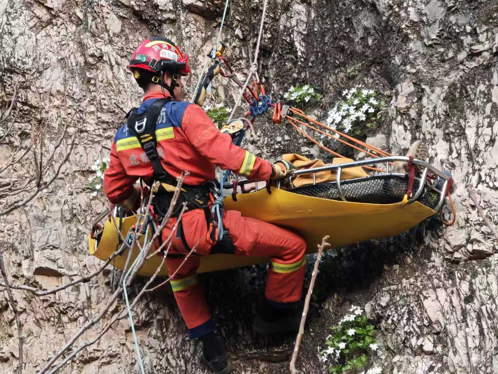 一场惊心动魄的担架水平下放转运救援,在陡峭山壁上就此展开。门头沟消防供图
