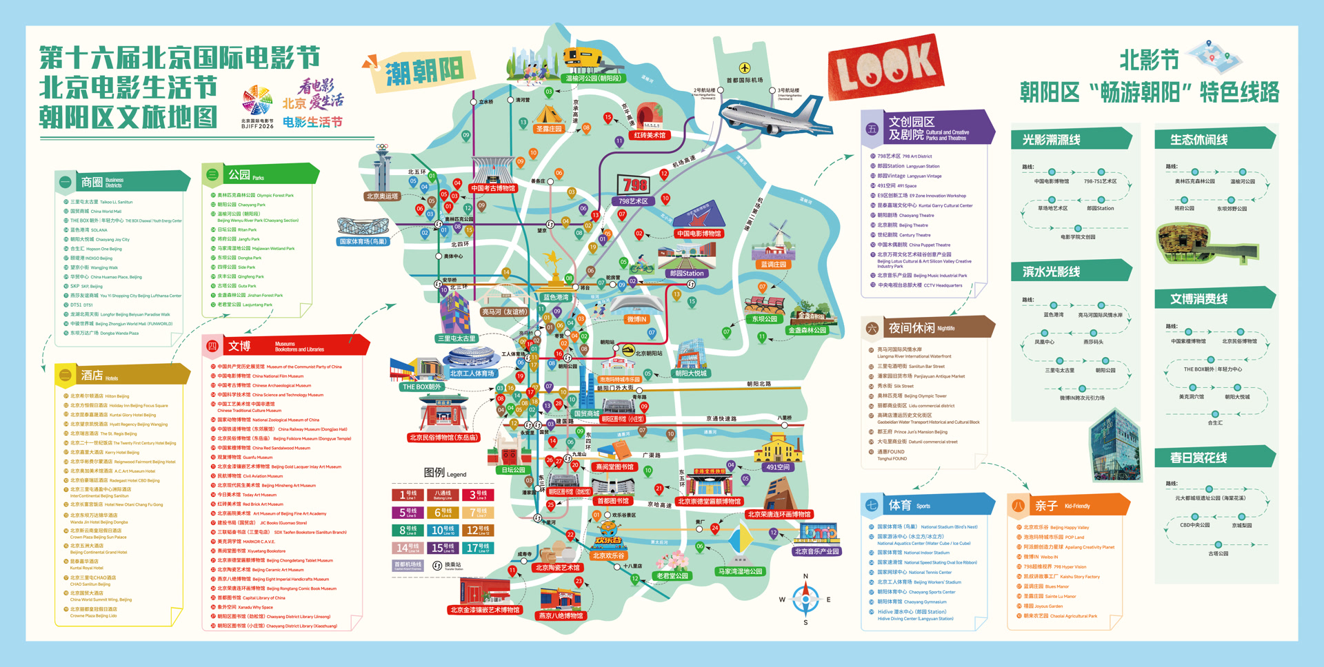朝阳区承办郎园Station主会场及“电影+”系列活动,期间将集中举办110余项活动。推出“一张票+三张图+五条线”系列举措:以北影节期间全国任意一张电影票根联动住宿、展览、娱乐等200余个商户推出优惠,延伸消费链条;打造美食、文旅、赏花三张主题地图,优化消费指引;定制5条“畅游朝阳”特色线路,串联区域内特色资源,让广大人民群众沉浸式感受朝阳区的文旅魅力。