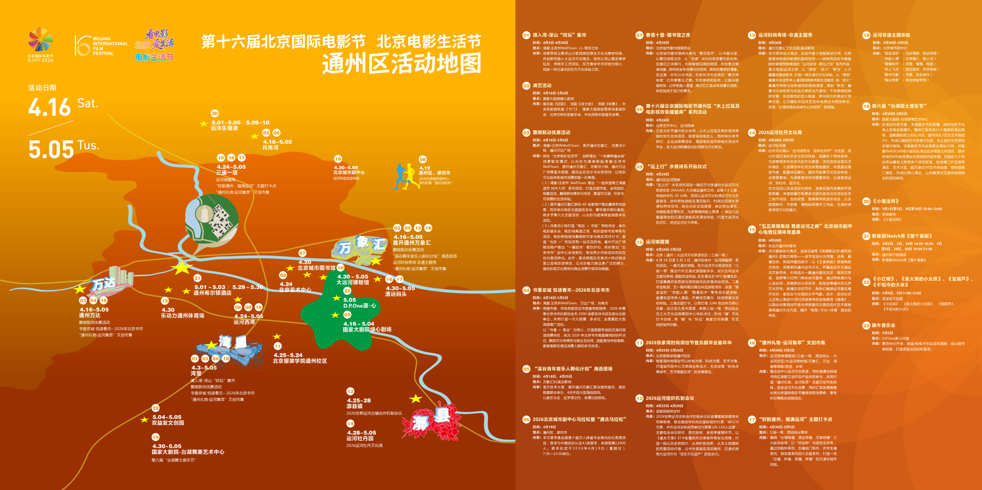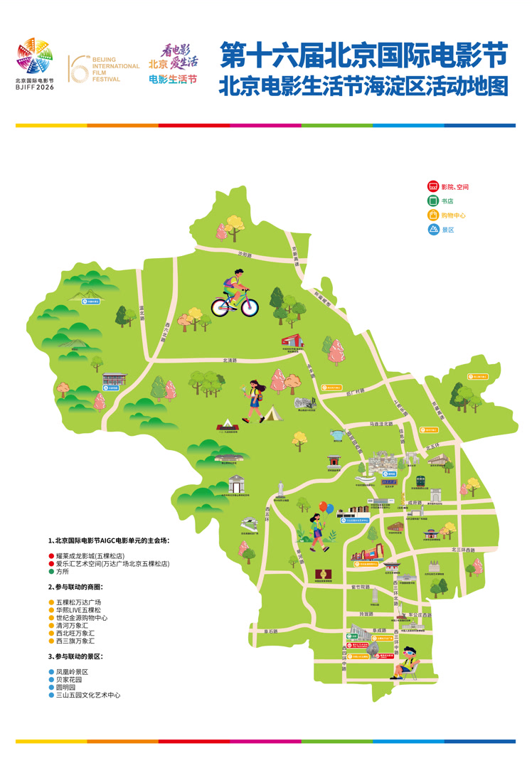 第十六届北京国际电影节将于4月16日至25日在北京举行。今年首次推出分会场的概念,除了在怀柔、朝阳2个区设置主会场之外,还在东城、西城、海淀、丰台、石景山、通州、大兴等7个区设置电影节分会场。9个区立足自身特色,精心打造丰富多样的配套活动,并推出专属活动地图。截至目前,覆盖全市17个区的50余个商圈、90余个商场、1500余家商户参与今年的北京电影生活节,共同营造电影活动全城开花、处处皆有电影节的良好氛围。