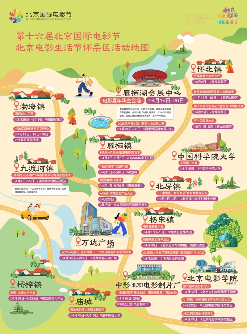 作为北影节核心举办区域,怀柔区围绕“电影+”主题,打造六大板块、四十余项活动,覆盖雁栖湖国际会展中心及区内十余个场地。活动融合时尚盛典、非遗展演、动漫音乐会、户外赛事、山花节等潮流与文旅项目;全区统筹300余个放映点位,计划开展700余场公益放映,让影视文化走进千家万户。