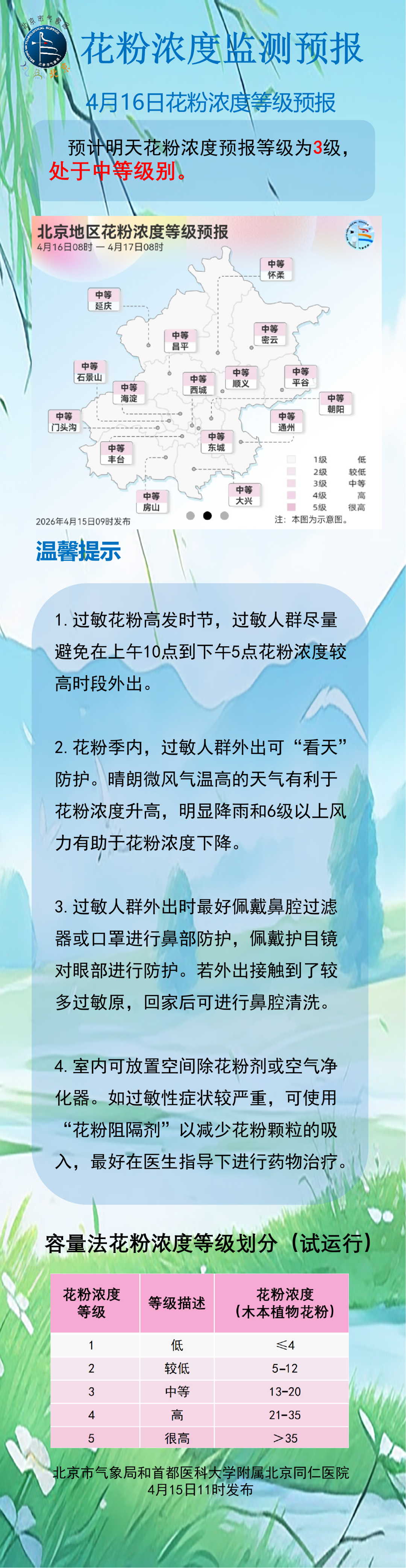 北京市气象局发布花粉浓度监测预报,预计4月16日花粉浓度预报等级为3级,处于中等级别。