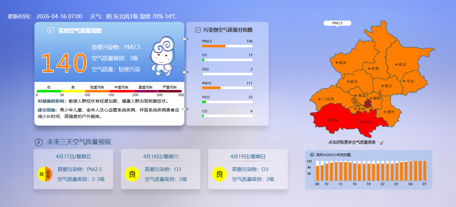 据北京市生态环境监测中心今早7时数据,目前实时空气质量指数140,空气质量轻度污染。