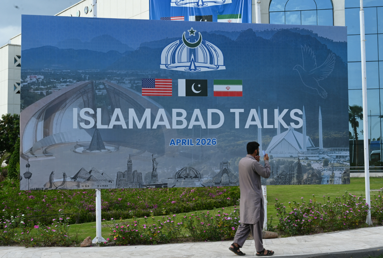 ▲这是4月11日在巴基斯坦首都伊斯兰堡拍摄的美伊谈判相关海报。图/新华社