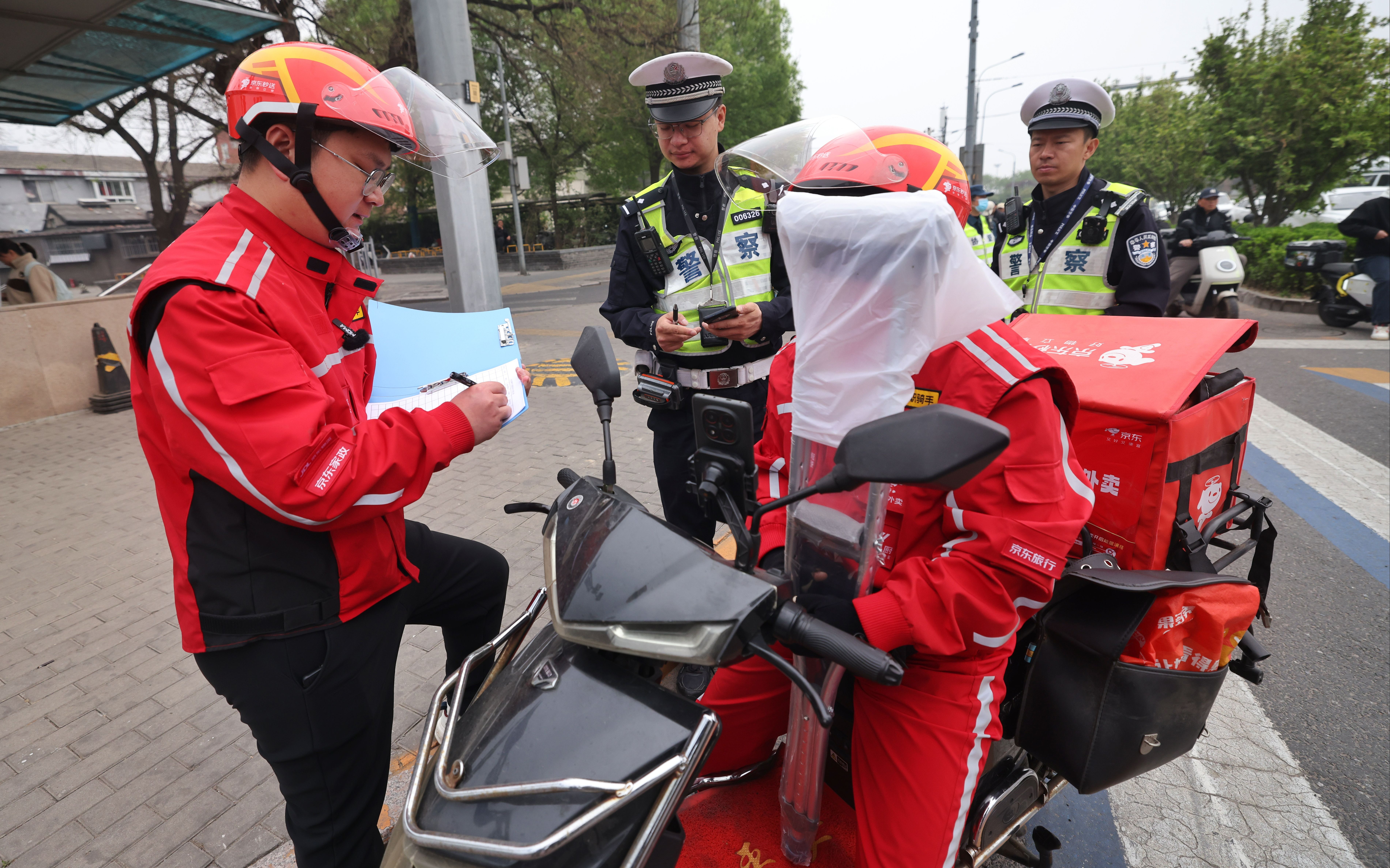 快递外卖骑手在电动自行车骑行群体中占比较大,今天上午,北京交警联合部分外卖配送企业安全负责人,共同在路面查处和管理骑手的交通违法问题。