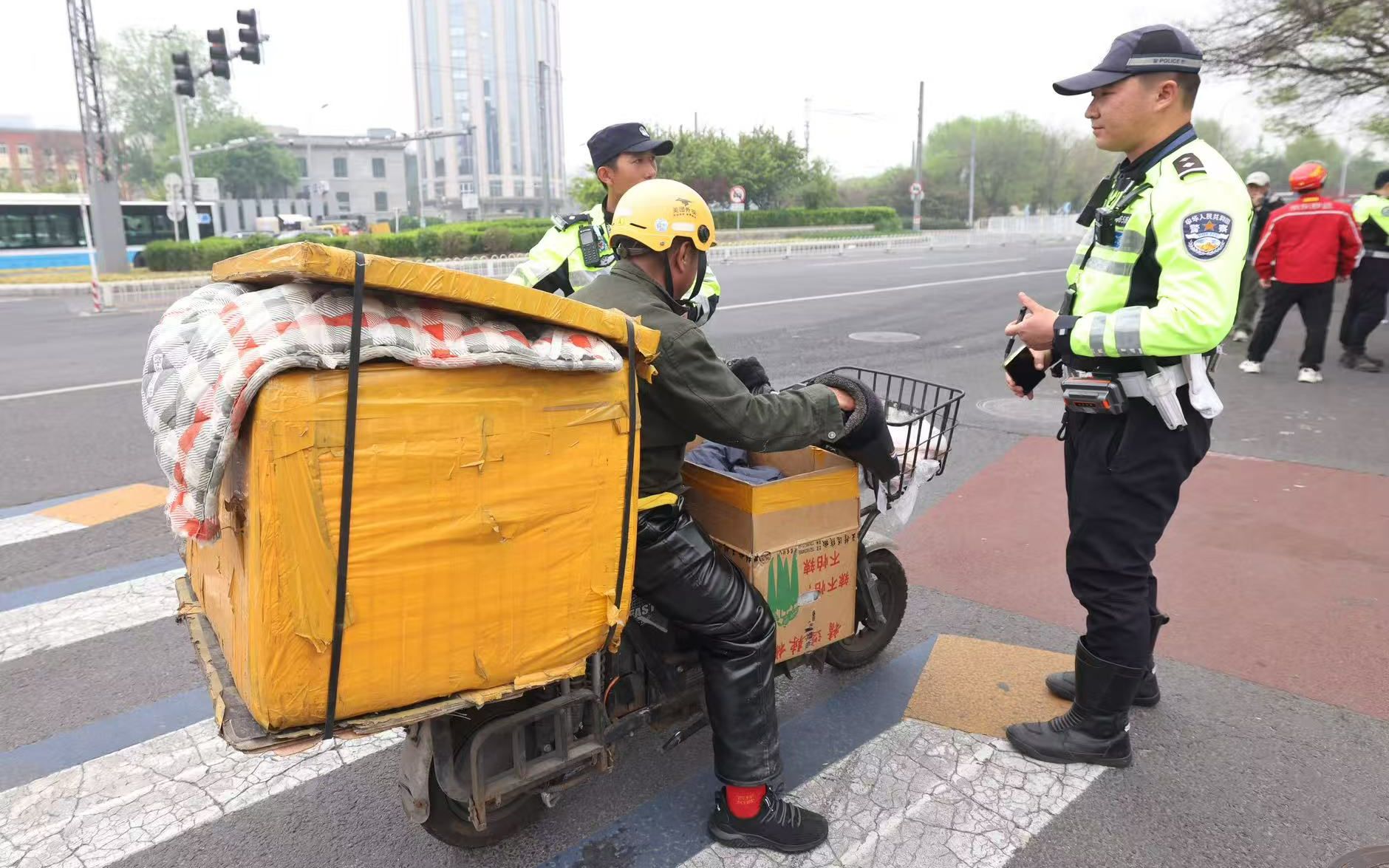 今天(4月16日)上午,记者在崇文门路口看到,交管部门在执法中拦下来几辆存在违法载货行为的电动自行车,有的是使用了超大号尾箱,也有的是未将货物妥善固定,存在安全隐患。上午10点50分,交警在路口拦下一辆电动自行车,外卖员一手扶着车把,一手攥着准备配送的一副拐杖,非常危险。随即,交警对其交通违法行为进行了处罚,并联合在路口共同参与秩序维护的外卖平台区域负责人进行登记,后续平台会对骑手进行更深入的安全教育。