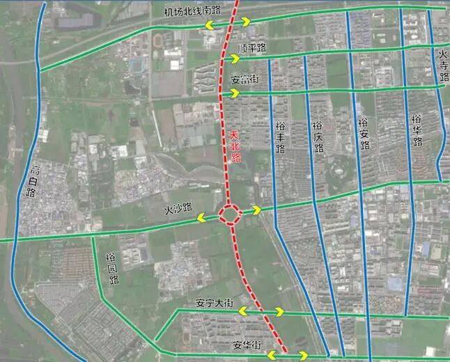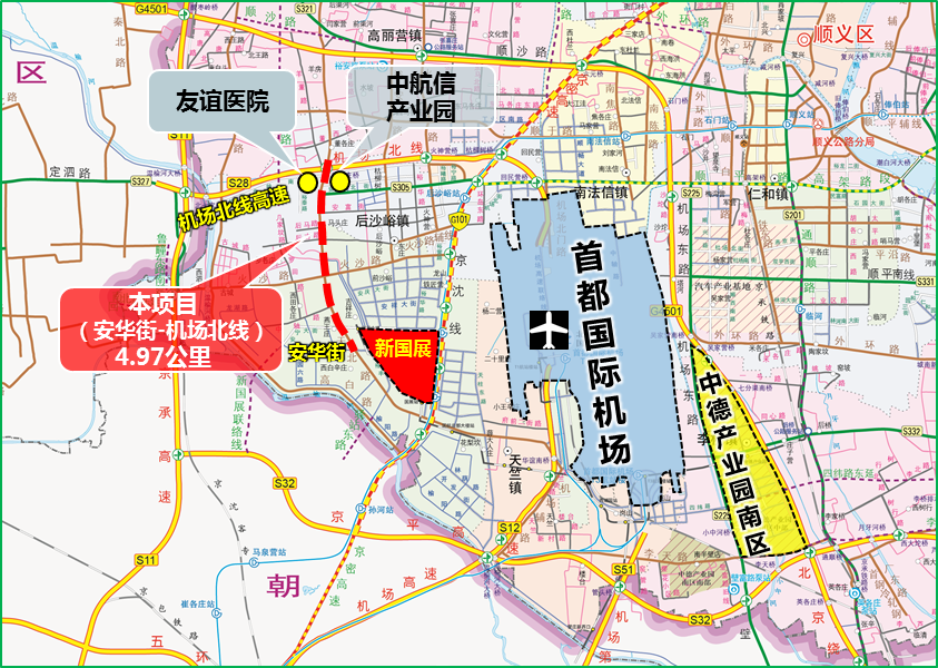 天北路改造路段南起安华街,北至机场北线高速,全长4.97公里,是连接首都国际机场、首都国际会展中心、北京中德产业园及北京友谊医院顺义院区的核心通道。