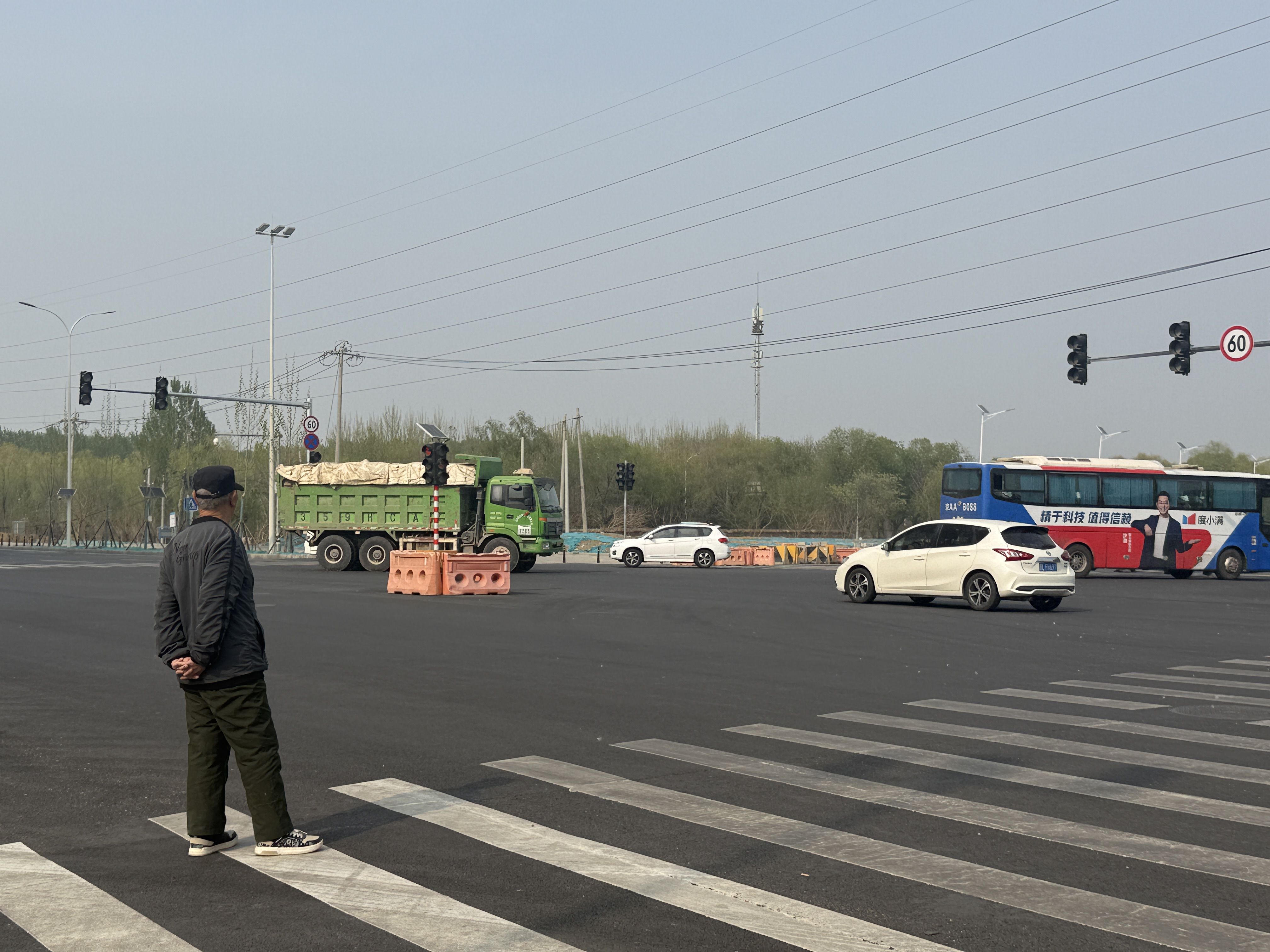 下午时段,路上的车流量并不算大,或许因为周边仍有工程施工,途经的大型货车、工程车辆占一小部分比例。“早晚高峰,走这条路的车更多些。印象中信号灯装了有几个月了。”住在附近的一位居民告诉记者,车流量大时,确实感到出行过马路不便利,尤其是很多大货车呼啸而过,“有点吓人。”