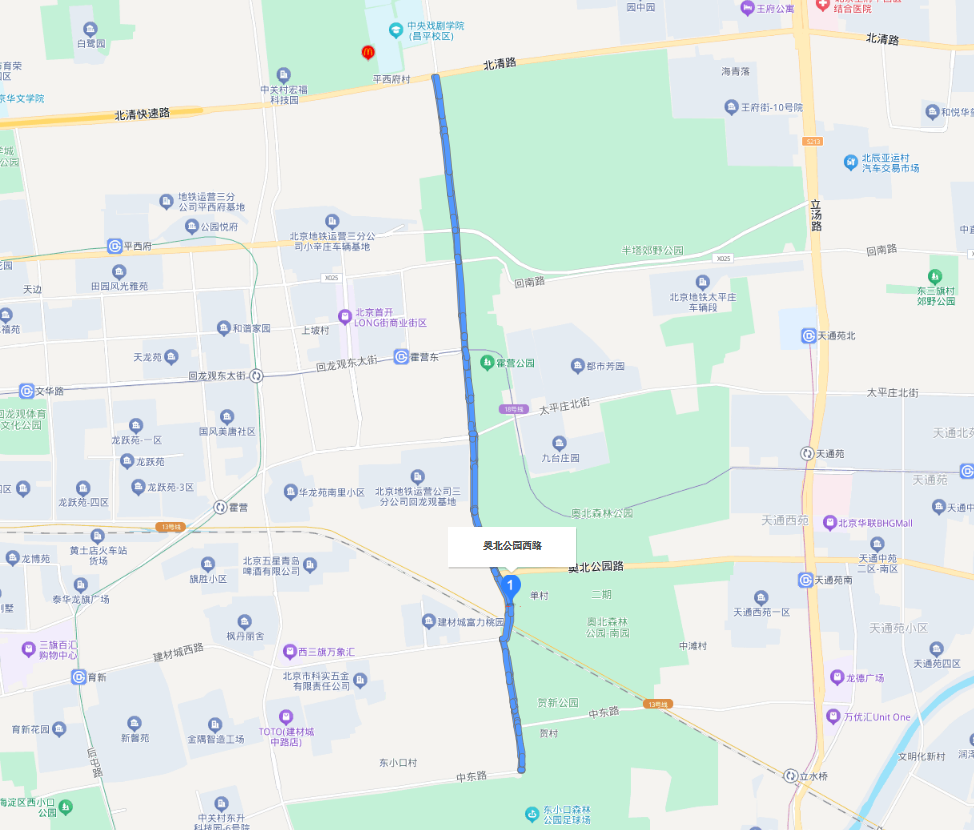 按地图显示,奥北公园西路位于昌平区,为南北向路段,连通北清路与正在建设中的中东路,全长约5公里,还未全线通车。本次市民反映问题的路段,位于奥北公园西路中段,即该路与回龙观东大街至奥北公园路交叉口之间,全长约1.7公里。