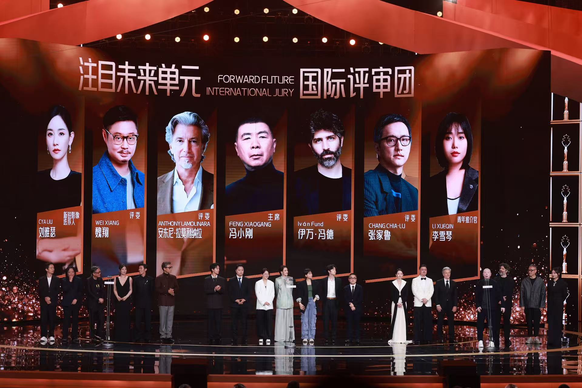 电影节三大单元评审团依次集体亮相。短片单元评审团主席刘伟强,携评委刘毅、马思纯、钱重远、周游及推荐官李乃文;项目创投单元终审评委团主席舒淇,携评委尹昉、杨子、应萝佳、邵艺辉、董子健及北京市场艺术总监张冀;注目未来单元国际评审团主席冯小刚,携评委安东尼·拉莫利纳拉、伊万·冯德、张家鲁、魏翔及新锐影像选荐人刘雅瑟、青年推介官李雪琴悉数登台。十六年的时间里,北影节始终深耕青年影人培育体系,从剧本到短片、长片,为青年创作者搭建起全流程生态体系,为中国电影产业持续注入源头活水。