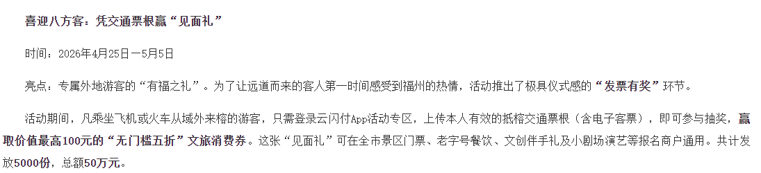 福建福州:凭外地抵榕交通票根,可参与抽奖赢取文旅消费券;
