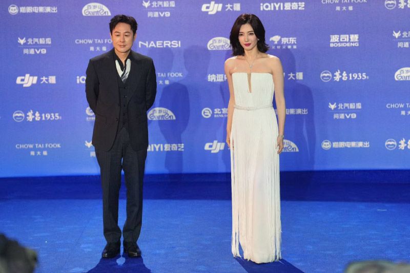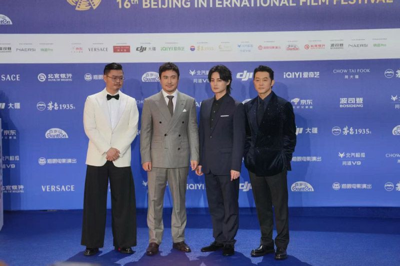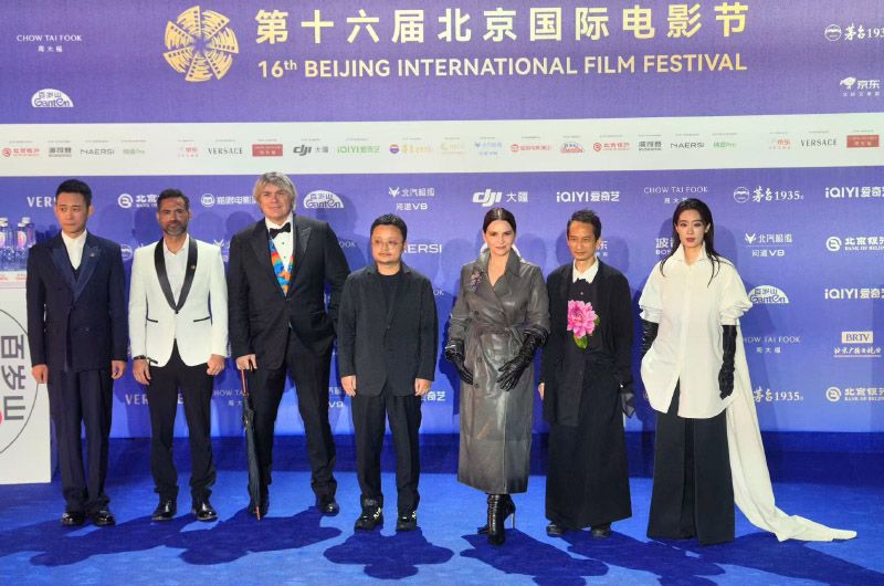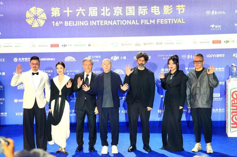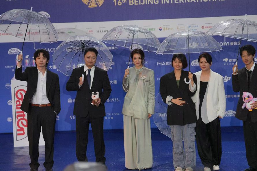 4月16日,第十六届北京国际电影节红毯仪式在雁栖湖国际会议中心举行,中外影人撑伞亮相,在雨幕与光影交织中,开启一场属于电影的春日盛会。图为项目创投终审评委团亮相红毯。