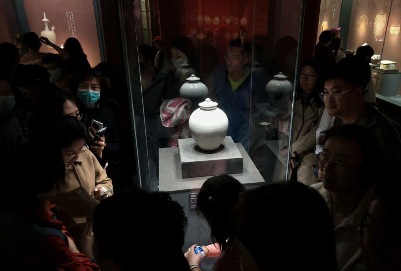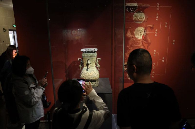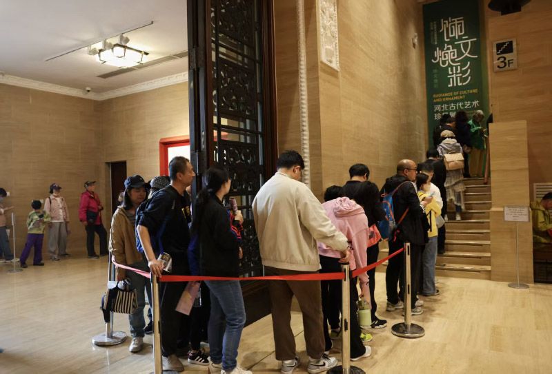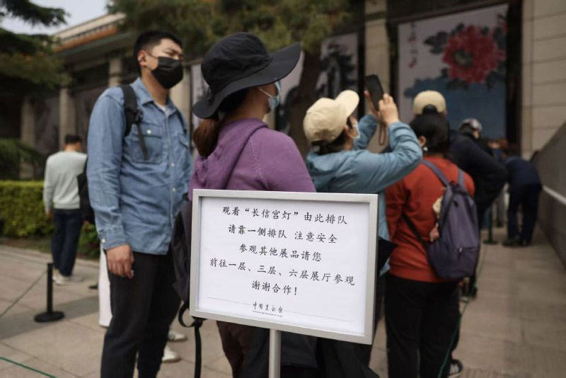 中国美术馆为长信宫灯设立专门通道,观众从一层楼梯一直排到五层展厅。