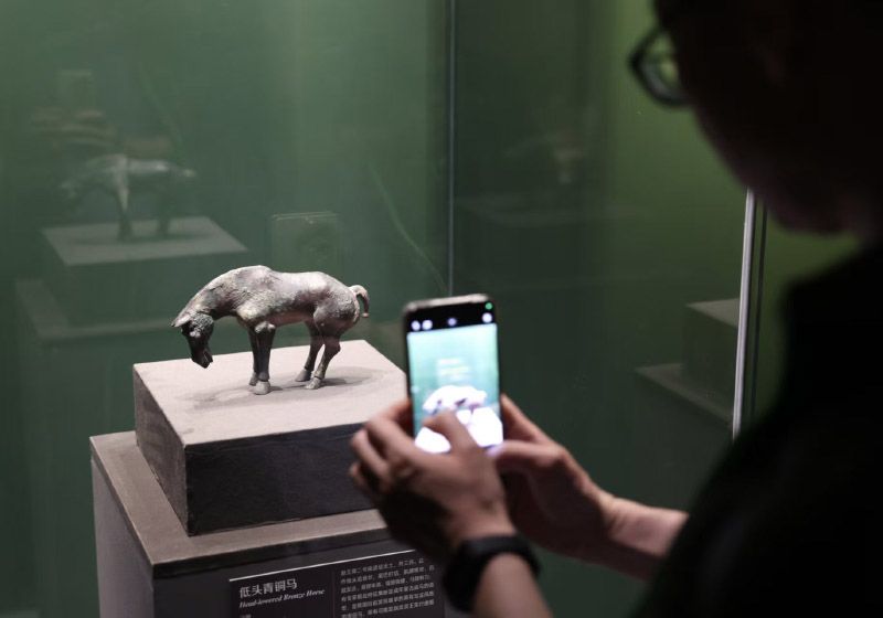 战国低头青铜马。赵王陵二号陵遗址出土,是我国目前发现最早的具有写实风格的青铜马,很有可能是赵武灵王实行胡服骑射改革的产物。