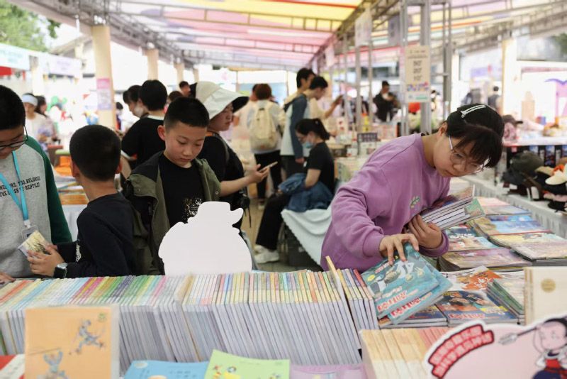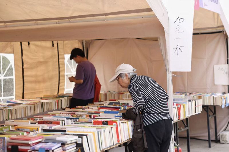 4月18日,2026北京书市启幕。四大集中展场(朝阳公园、南苑森林湿地公园、首钢园、圆明园)总面积约1.6万平方米,近500个展棚。其中圆明园展场突出“三山五园”文化底蕴,分为实体书店区、非遗文化体验区、“旧书新知”专区,集中展销传统文化、历史类图书与文创产品。图为游客在圆明园集中展场挑选五折图书。