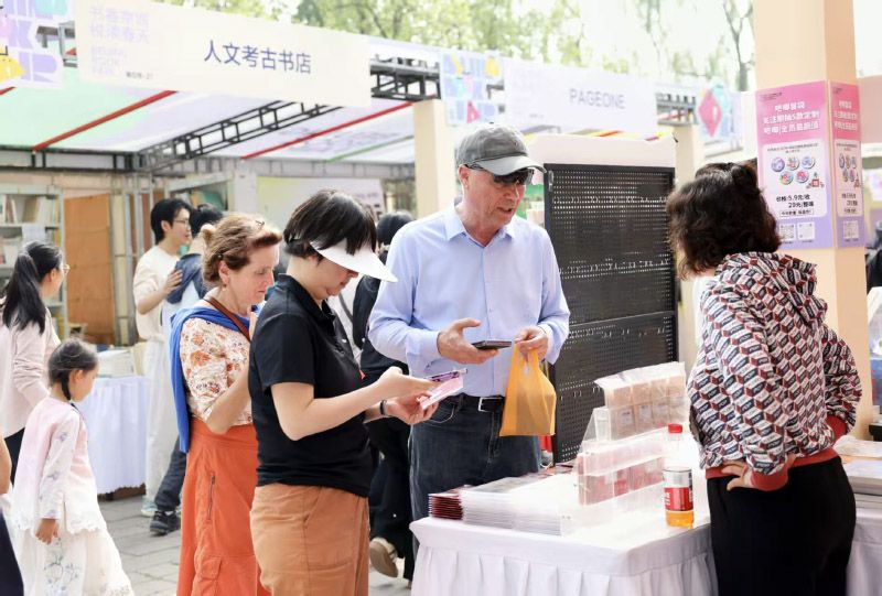 外国游客在书市上购买文创产品。