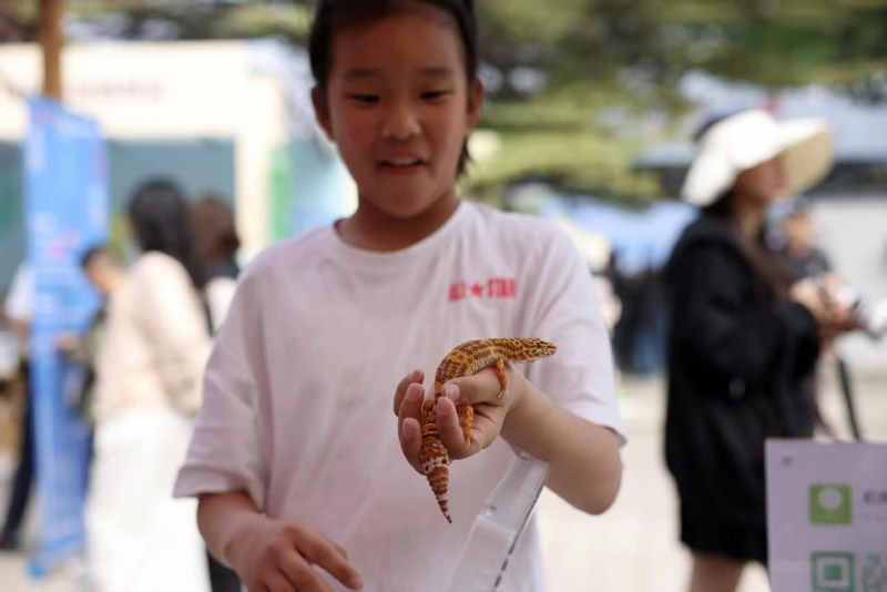 小朋友与宠物蜥蜴亲密接触。