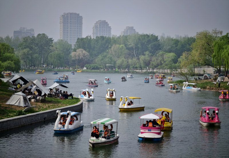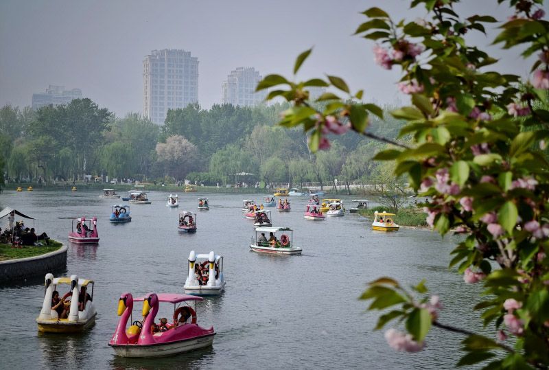 4月18日,朝阳公园,春风和煦,游客泛舟湖上。
