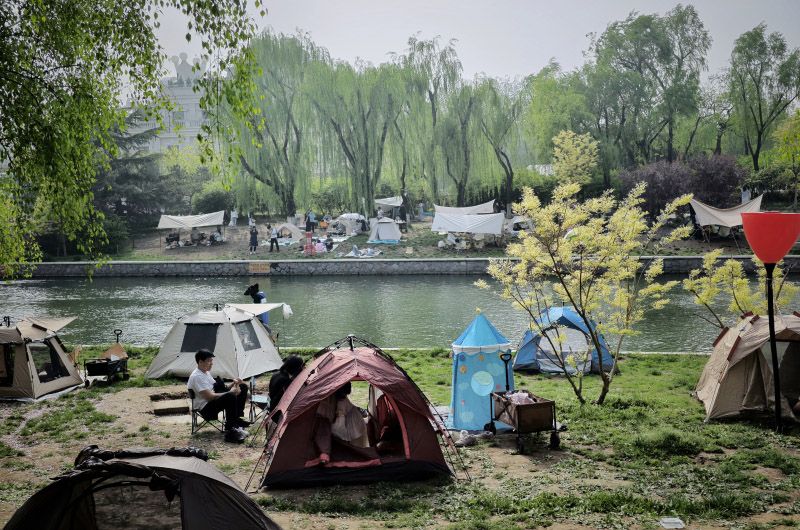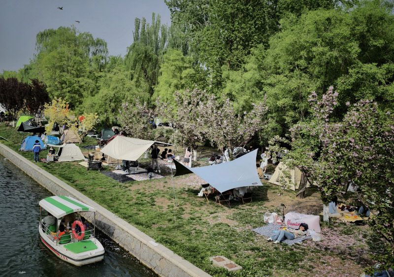 4月18日,朝阳公园,游客在草坪上惬意露营。