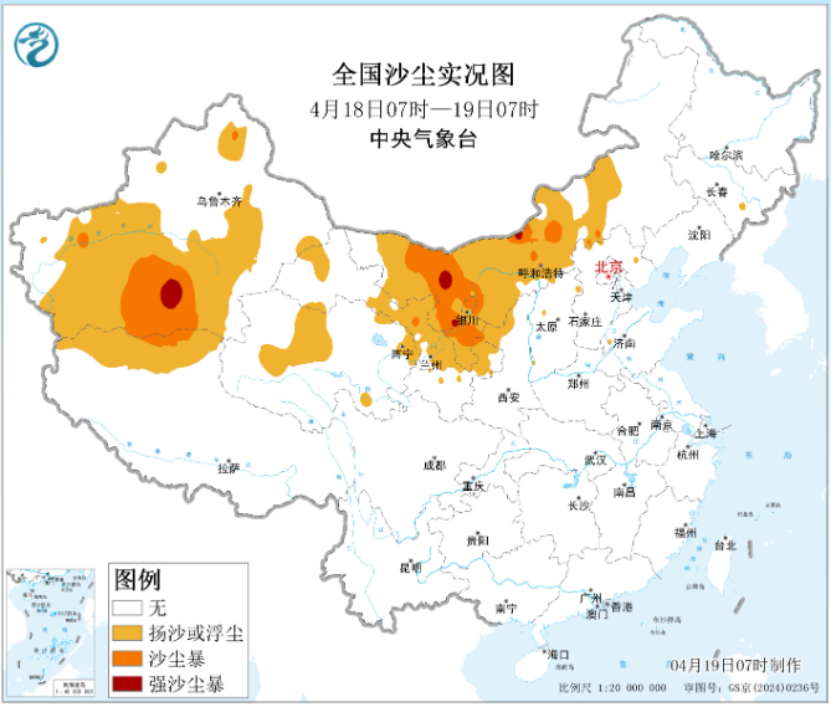 同时,新疆南部和东部、甘肃中西部、青海北部、内蒙古中西部和东南部、宁夏、陕西大部、山西、河北、北京、天津、河南北部、山东西北部、辽宁西部、吉林西部等地的部分地区有扬沙或浮尘天气,其中,新疆南部、内蒙古中部等地的部分地区有沙尘暴。