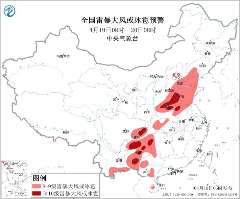 除了冷空气带来的大风天气,雷暴大风也不容小觑。预计4月19日8时至20日8时,华北东部和南部、黄淮大部、江汉西部、西南地区东部和南部、华南西部等地的部分地区将有8级以上雷暴大风或冰雹天气,其中,河北南部、山东中西部、河南中北部和东部、安徽北部、湖南西部、四川盆地东南部、重庆中部、贵州中北部、广西西部等地的部分地区将有10级以上雷暴大风,最大风力可达11级以上。