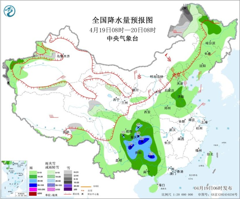 今天,内蒙古东北部、黑龙江西北部、新疆南疆西部山区和沿天山地区西段、青海南部和东北部等地部分地区有小到中雪或雨夹雪,其中,内蒙古东北部、黑龙江西北部、新疆南疆西部山区等地部分地区有大到暴雪(10~12毫米);黑龙江西北部、河北南部、山东西部、四川东部、重庆、贵州、云南东部、湖南西部、广西大部等地部分地区有中到大雨,其中,重庆东南部、贵州北部、广西北部等地部分地区有暴雨(50~80毫米)。同时,华北南部、黄淮中西部、西南地区东部和南部、华南西部等地的部分地区将有小时雨量大于20毫米的短时强降水天气,其中,重庆中西部、贵州西部和北部、广西西部和南部沿海等地的部分地区小时雨量大于50毫米,最大可达60毫米以上。强对流的主要影响时段为今天午后至夜间。