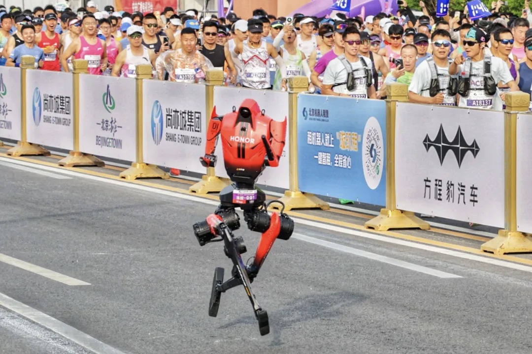 新京报讯(记者吴婷婷)4月19日上午,2026年北京亦庄人形机器人半程马拉松杀出黑马,身披红色战袍的荣耀机器人闪电以遥控方式参赛,成为首位冲线机器人。
