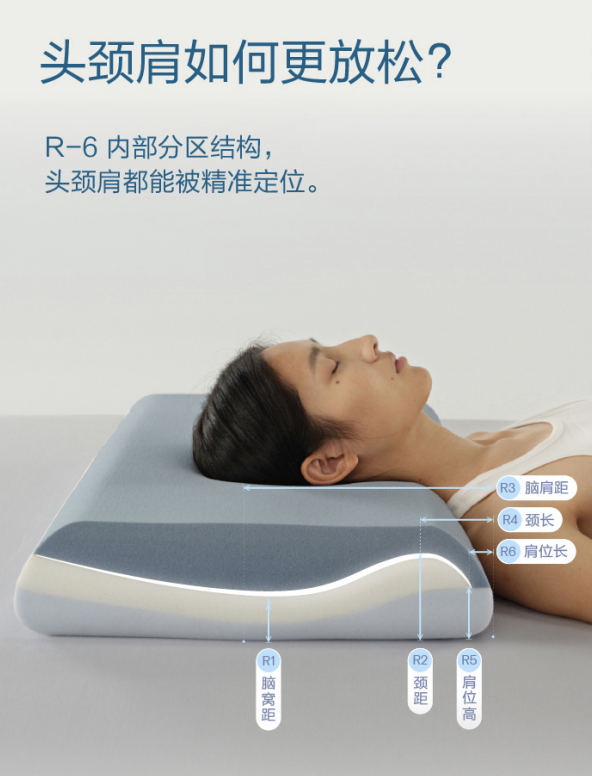 产品通过R6分区支撑结构,精准定位头、颈、肩,给到恰好的支撑力,在翻身过程中维持压力稳定,实现无感翻身。整体采用多层记忆绵组合设计,接触头部时能提供适度缓冲,缓解瞬时压力,同时形成贴合支撑,减少因变化带来的不适感,助力身体放松。